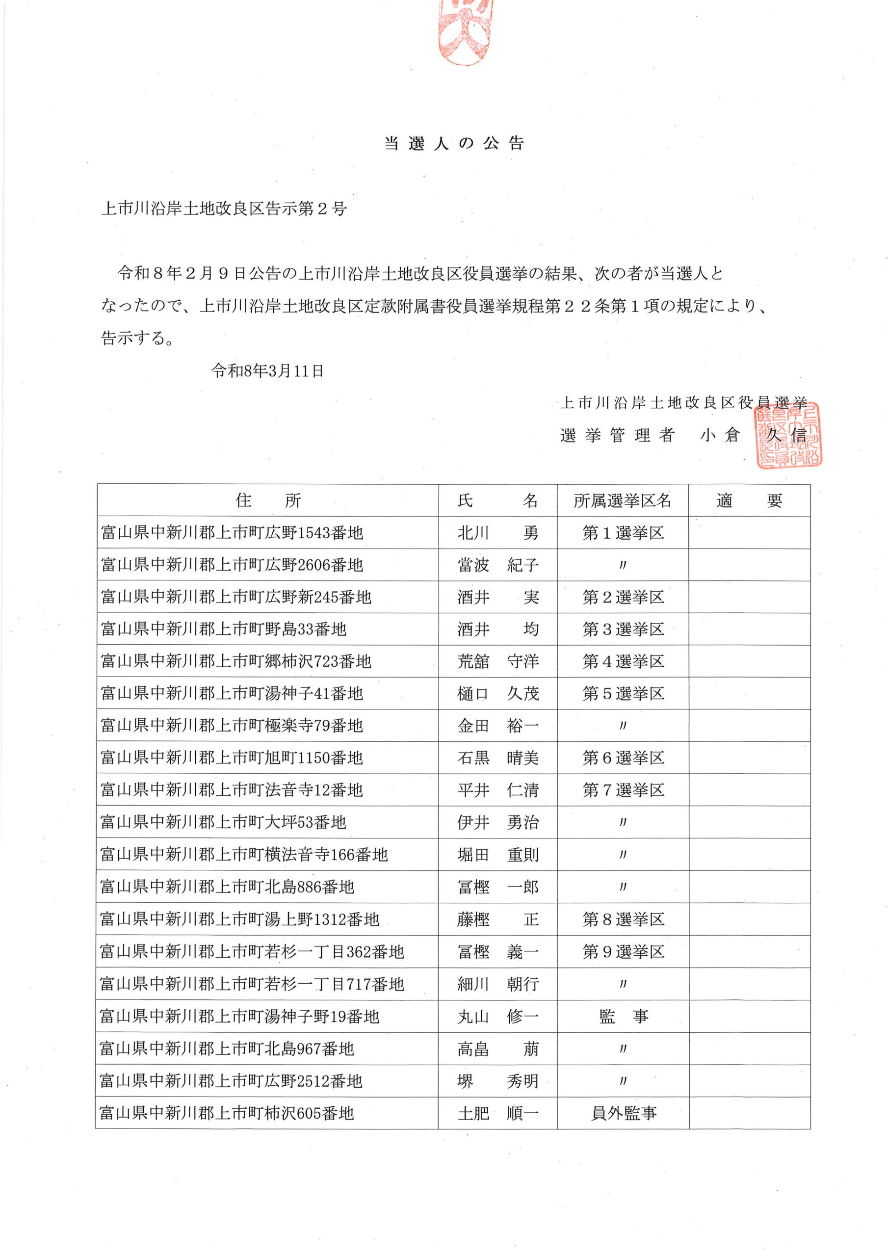 役員選挙の当選公告 2026年3月11日 お知らせ by kamiichiengan. 立候補及び推薦が定数を超え選挙となった選挙区はありませんでした。 3月11日に開催された選挙会により当選した理事及び監事は下記の通りです。 3月17日までに異議申し立て及び辞退申告がなかった場合、当選が確定します。 前の記事