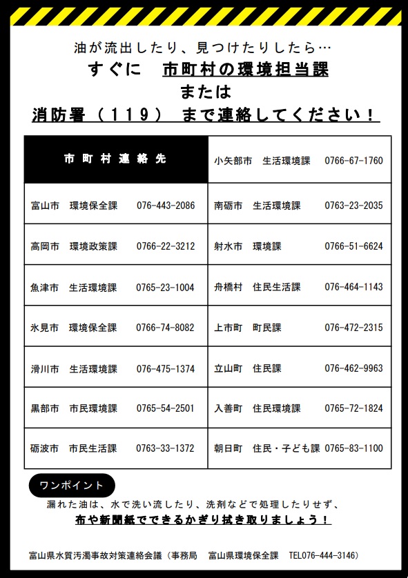 万が一油漏れがあった場合は、すぐに砺波市市民生活課(0763-33-1372)または消防署(119)へ